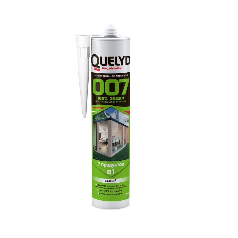 Монтажный клей-герметик Quelyd 007 Универсальный на основе SMP – технологий для любых строительных работ внутри и снаружи помещения. Высыхание происходит при реакции с влагой воздуха, образуя прочное эластичное соединение. Quelyd 007 Универсальный специально разработан, как универсальный герметик для всех видов соединительных швов, трещин и стыков большинства материалов в строительстве и промышленности. Универсальный клей-герметик для металла, синтетических материалов, стекла, дерева, бетона и т.д. Может быть использован в таких областях как: автомобилестроение; морская техника; вентиляционные системы; сборное домостроение; фасады; оконные рамы; строительство деревянных конструкций, зданий и сооружений; фурнитура.
