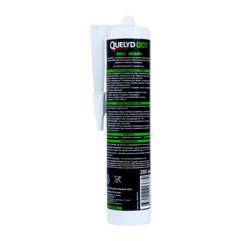Монтажный клей-герметик Quelyd 007 Универсальный на основе SMP – технологий для любых строительных работ внутри и снаружи помещения. Высыхание происходит при реакции с влагой воздуха, образуя прочное эластичное соединение. Quelyd 007 Универсальный специально разработан, как универсальный герметик для всех видов соединительных швов, трещин и стыков большинства материалов в строительстве и промышленности. Универсальный клей-герметик для металла, синтетических материалов, стекла, дерева, бетона и т.д. Может быть использован в таких областях как: автомобилестроение; морская техника; вентиляционные системы; сборное домостроение; фасады; оконные рамы; строительство деревянных конструкций, зданий и сооружений; фурнитура.