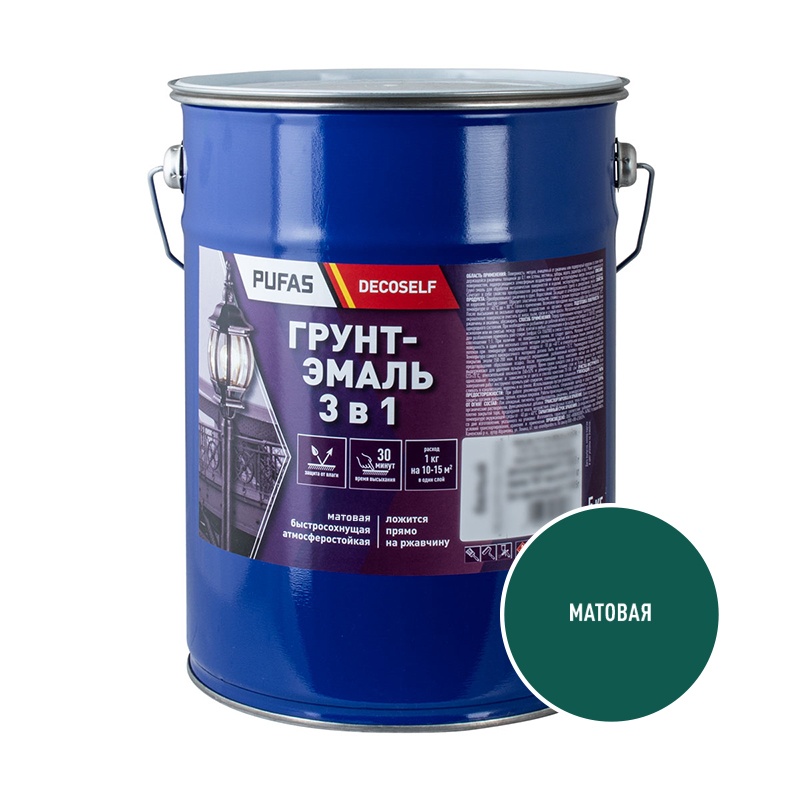 Грунт-эмаль Pufas Decoself 3 в 1 быстросохнущая матовая зеленая (5 кг)