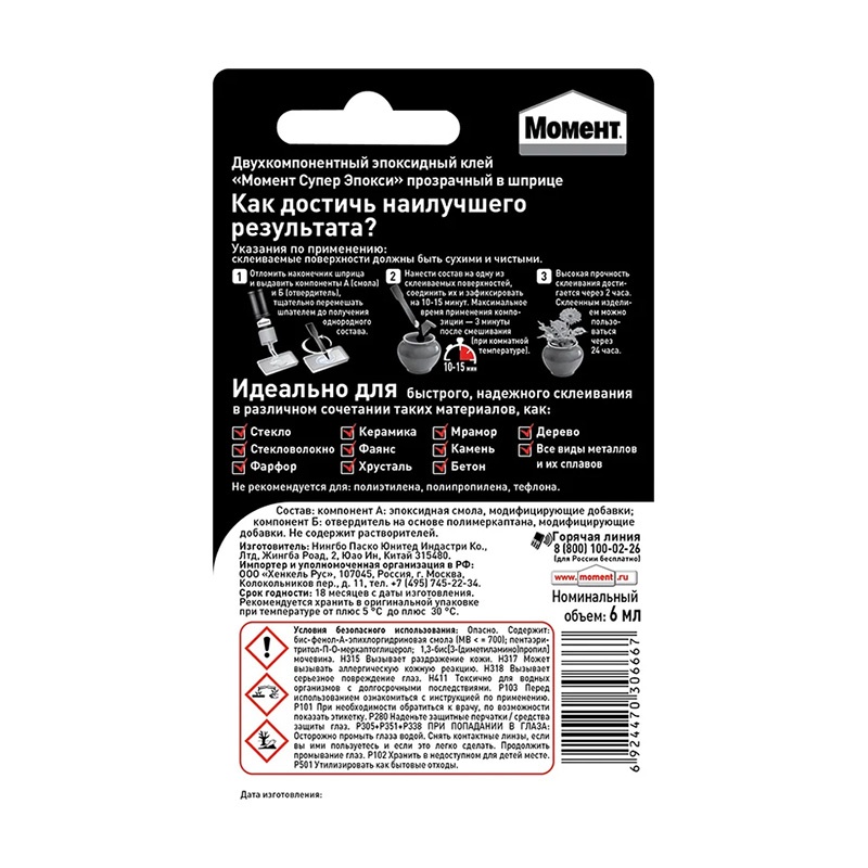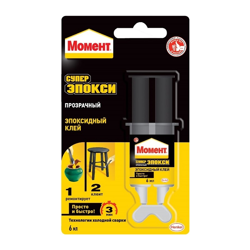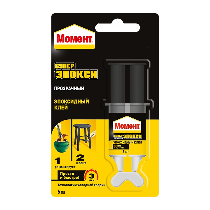 Клей Момент Супер Эпокси прозрачный, шприц на блистер-карте (6 мл)