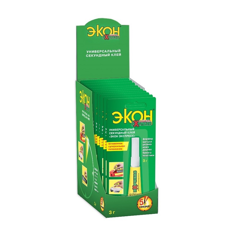 Предназначены для ремонта различных предметов в считанные секунды. Клей хорошо растекается, заполняет мельчайшие трещины. Формула нового секундного клея ЭКОН обеспечивает мгновенное соединение материалов, которое сохраняет свою прочность в течение длительного времени. Предназначен для всех видов быстрых ремонтных работ в быту. Мгновенно склеивает фарфор, керамику, металл, резину, кожу, дерево, бумагу, пластики, пробку в различных сочетаниях, кроме посуды, контактирующей с пищей.