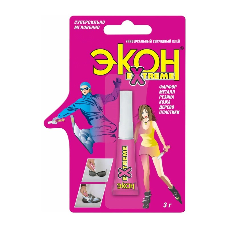 Предназначен для ремонта различных предметов в считанные секунды. Клей хорошо растекается, заполняет мельчайшие трещины. Формула нового секундного клея ЭКОН обеспечивает мгновенное соединение материалов, которое сохраняет свою прочность в течение длительного времени. Предназначен для всех видов быстрых ремонтных работ в быту. Мгновенно склеивает фарфор, керамику, металл, резину, кожу, дерево, бумагу, пластики, пробку в различных сочетаниях, кроме посуды, контактирующей с пищей.