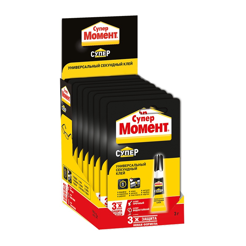 Предназначен для всех видов быстрых ремонтных работ в быту, мастерской, автомобиле, при конструировании моделей. Мгновенно склеивает в любых сочетаниях фарфор, керамику, дерево, кожу, резину, металл, пробку, картон, большинство пластиков. Клей хорошо растекается, заполняет мельчайшие трещины. Застывает за 5 секунд.