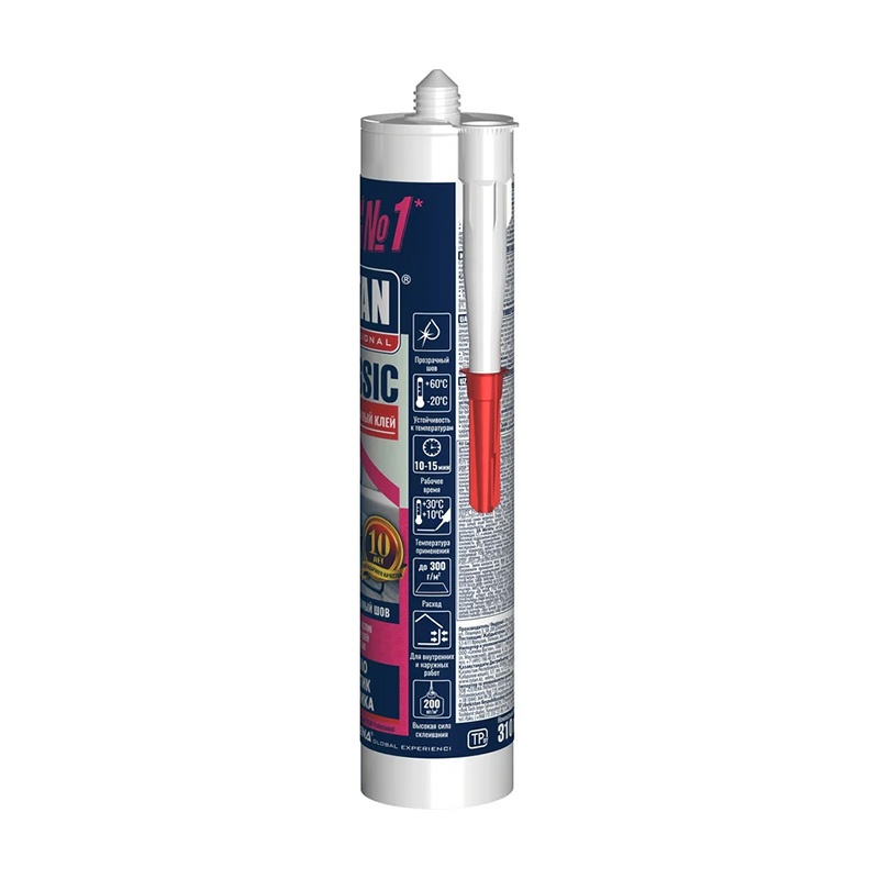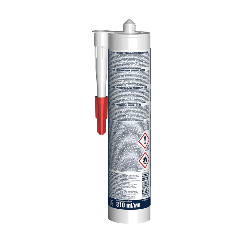 Предназначен для большинства строительных материалов для финишных и реконструкционных работ. После отверждения образует эластичный и прозрачный шов. Имеет отличную адгезию к типичным строительным основаниям: бетон, древесина, кирпич, штукатурка. Применяется для монтажа тяжелых и легких материалов, элементов декора, изделий из пенополиуретана, древесины и ее производных, металла, стекла, твердых пластиков (ПВХ, АБС, поликарбоната).