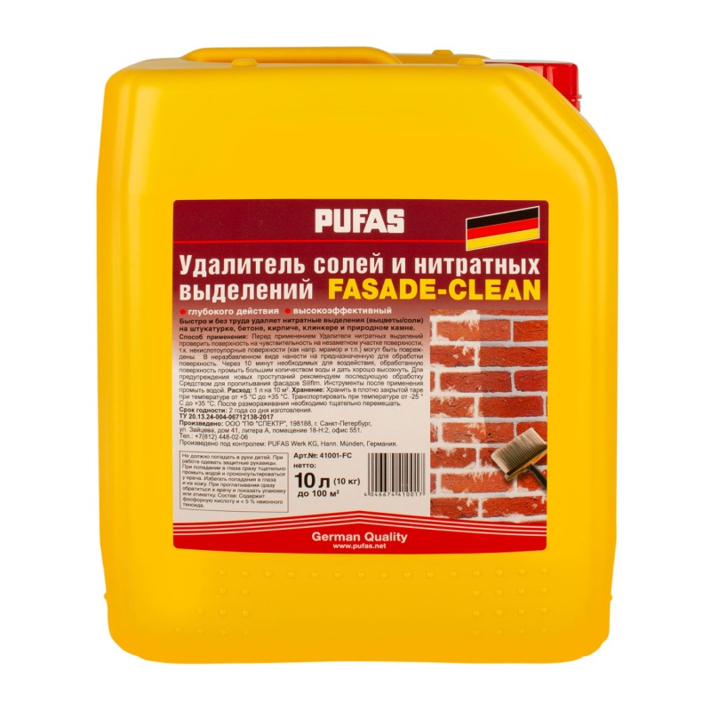 Предназначен для удаления нитратных солей с бетонных и цементных конструкций и высолов с клинкерного и силикатного кирпича. Используется для подготовки минеральных фасадов перед окраской фасадными красками или сезонной очистки кирпичных фасадов для улучшения внешнего вида. Также применяется для очистки декоративных элементов из природного камня (за исключением мрамора). Подходит для очистки дорожек из камня, бордюрных камней.