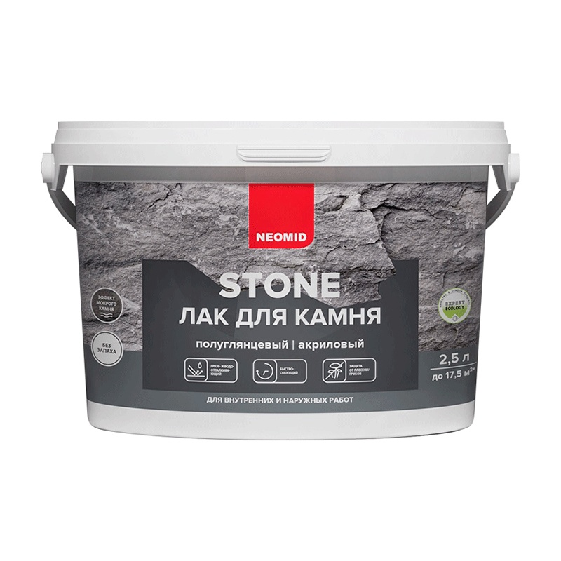 Лак для камня Neomid Stone предназначен для защитно-декоративного лакирования кирпичных и каменных поверхностей. Применяется для внутренних и наружных работ. Лак для камня мокрый камень используется по природному и искусственному камню, кирпичу, бетону, натуральной черепице, известняку.