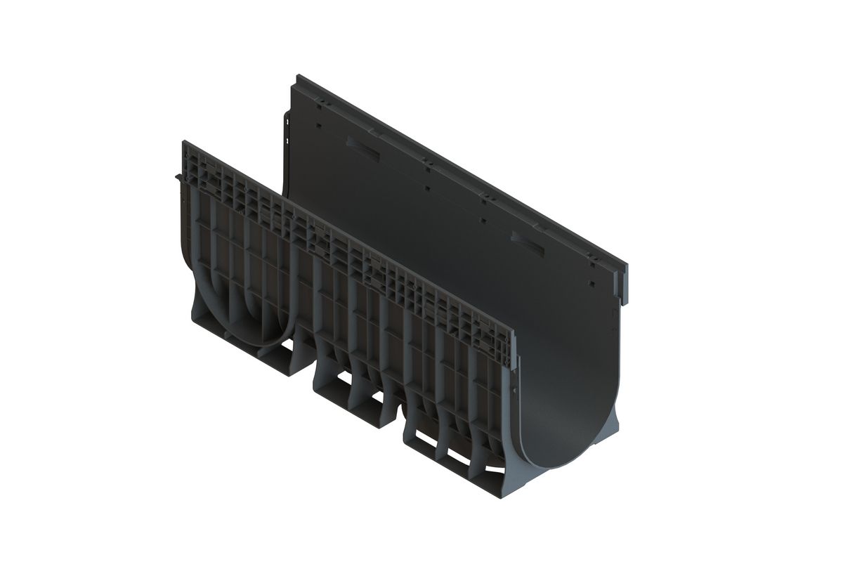 HTML:Лоток водоотводной пластиковый Basic DN300, H354 может комплектоваться решетками от нагрузки А15 до С250. В зависимости от решетки может применяться для отведения стоков как на частном участке где исключительно пешеходная нагрузка, так и в местах, где возможен наезд легкового автомобиля.