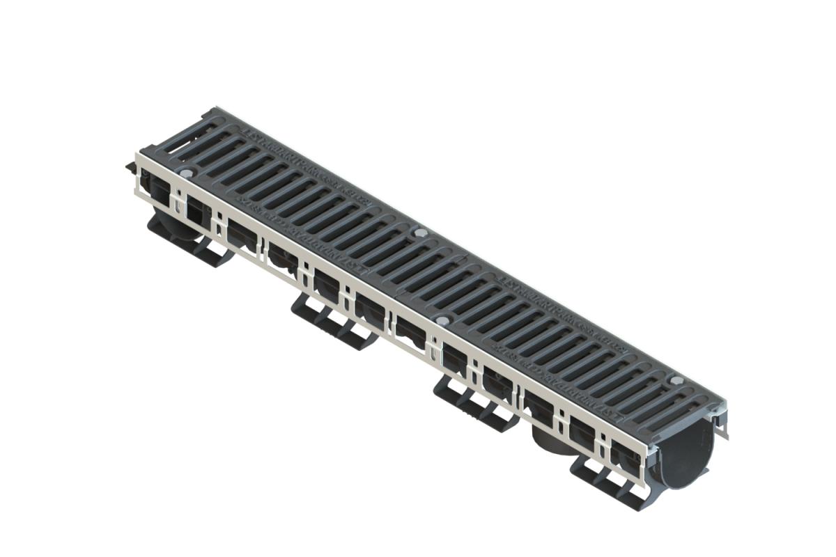 HTML:Лоток водоотводной пластиковый Drive DN100, H120 c решеткой из высокопрочного чугуна класса нагрузки С250. Применяется для отведения стоков на участке где возможен наезд легкового автомобиля. Поставляется комплектом.
