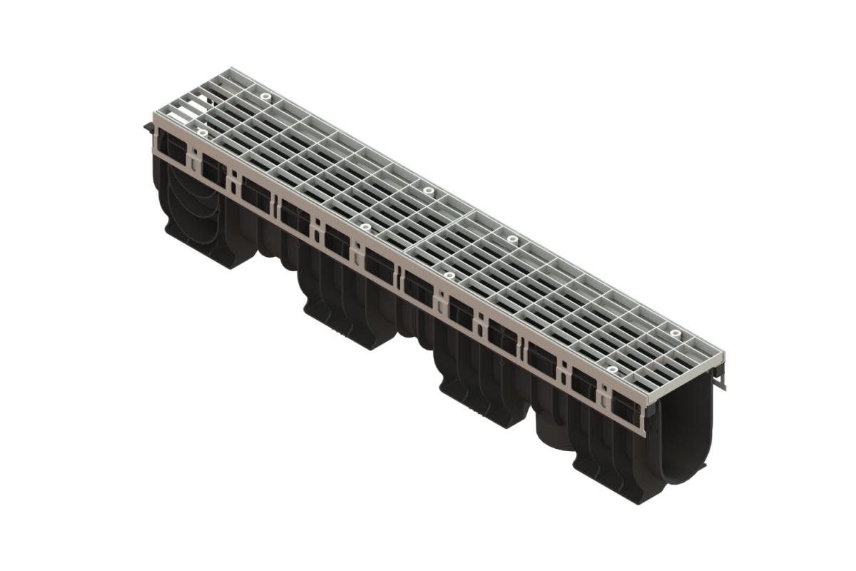 HTML:Лоток водоотводной пластиковый Drive DN100, H60 c решеткой из высокопрочного чугуна класса нагрузки С250. Применяется для отведения стоков на участке где возможен наезд легкового автомобиля. Поставляется комплектом.