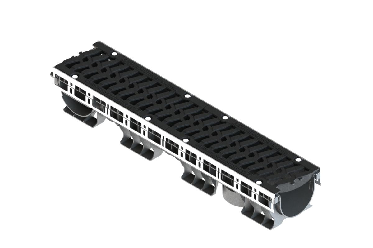 HTML:Лоток водоотводной пластиковый Drive DN150, H200 c решеткой из высокопрочного чугуна класса нагрузки E600. Применяется для отведения стоков на поверхностях, на которые оказывается высокая нагрузка колесами транспорта, например, разделительные полосы, островки безопасности, обочины на автомобильных дорог разных категорий. Поставляется комплектом.