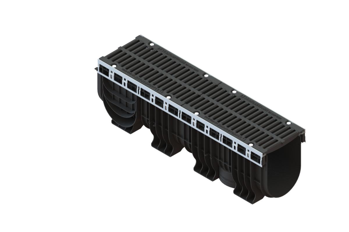HTML:Лоток водоотводной пластиковый Drive DN200, H300 c решеткой из высокопрочного чугуна класса нагрузки D400. Применяется для отведения стоков на полосах движения на автомобильных дорогах, боковых полосах, а также местах стоянок автотранспорта, на которых разрешено движение всех видов транспортных средств. Поставляется комплектом.