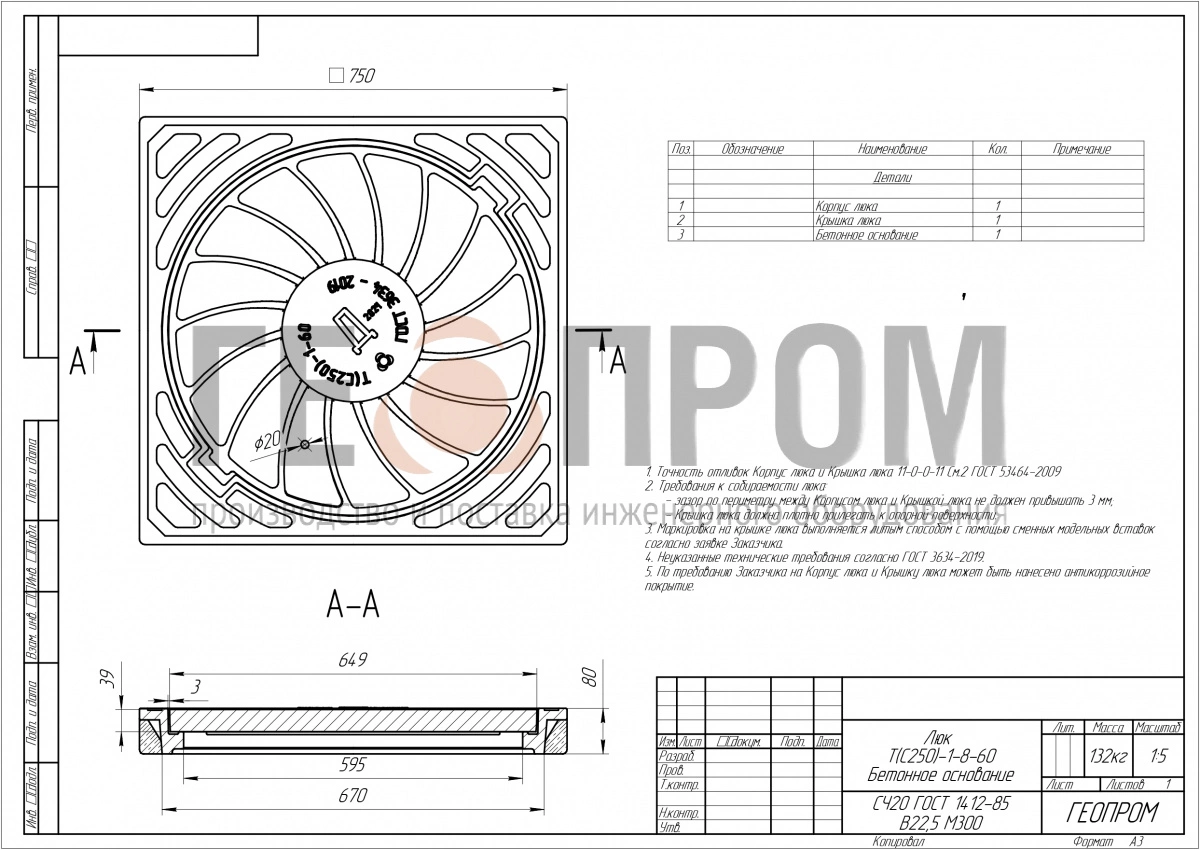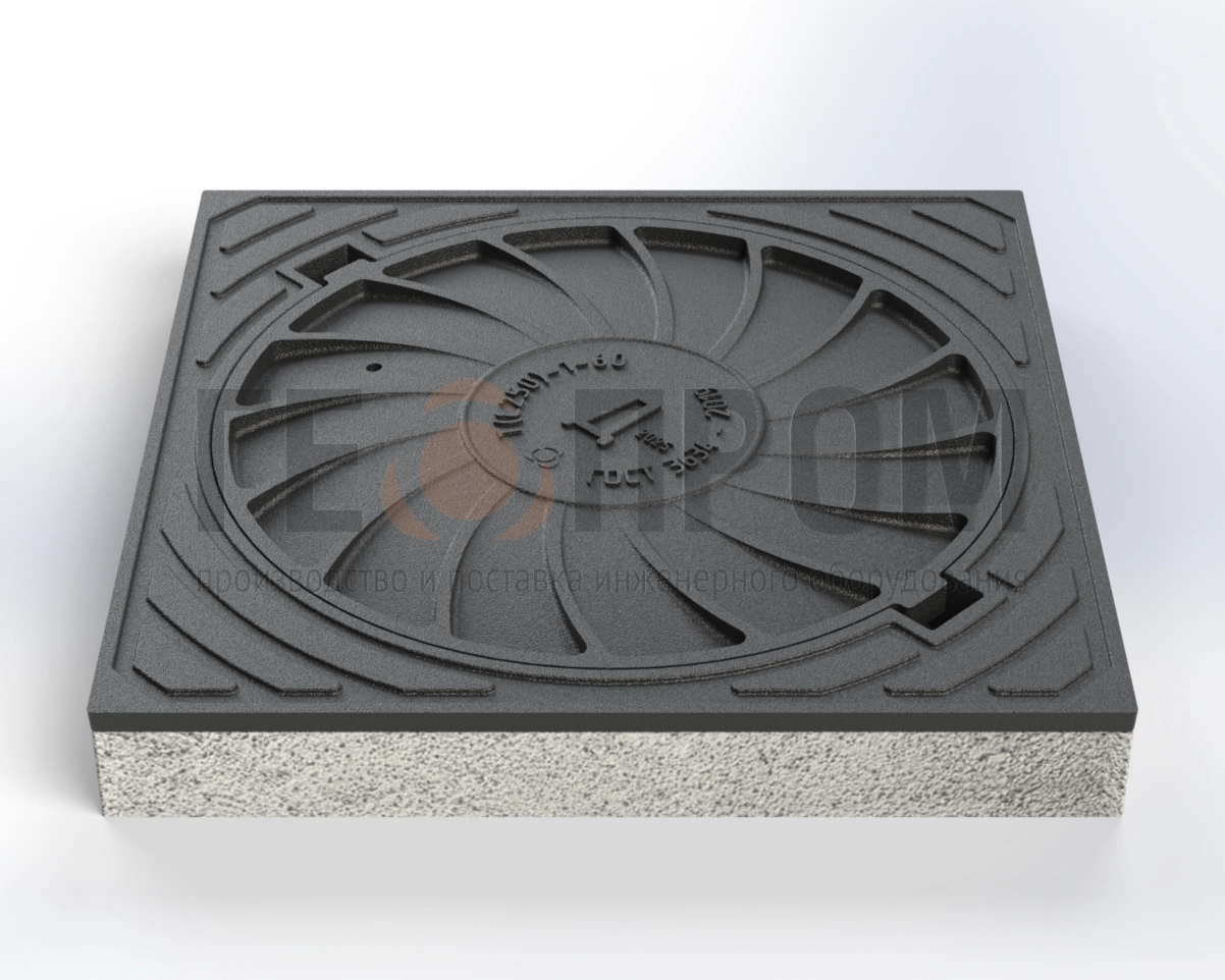 Квадратный чугунный люк тяжелого типа изготовлен из серого чугуна и предназначен для установки на тротуарах, где укладывается тротуарный камень или брусчатка. Крышка люка круглая, лаз в открытом виде диаметром 600 мм. Данный люк выдерживает нагрузку 15 тонн.