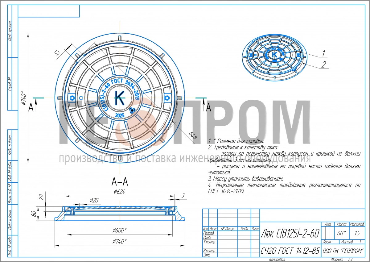 Люк (В125)-2-60 спроектирован для обеспечения надежной защиты подземных коммуникаций в зонах с умеренной нагрузкой. Конструкция изделия соответствует требованиям ГОСТ 3634-2019 и включает в себя ключевые элементы, повышающие эксплуатационную безопасность.