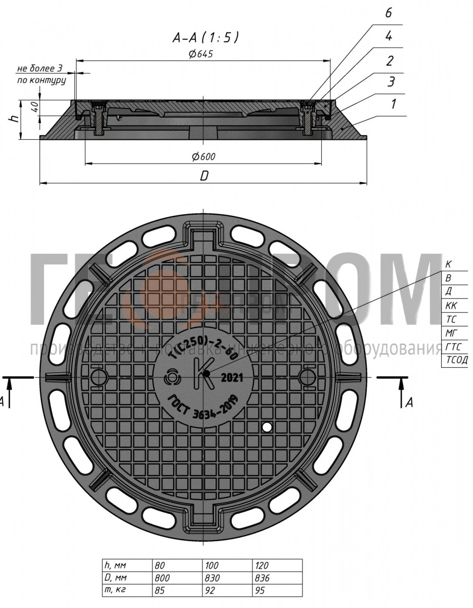 Комплект из крышки и корпуса люка, с местом для установки эластичного уплотнителя из РТИ. Люки изготовлены из высокопрочного чугуна СЧ-20 по ГОСТ 53464-2009. Класс выдерживаемой нагрузки составляет С250 с номинальной нагрузкой 25т. Установка люка возможна на нагруженных дорогах общего пользования, заводских территориях, пешеходных дорожках.