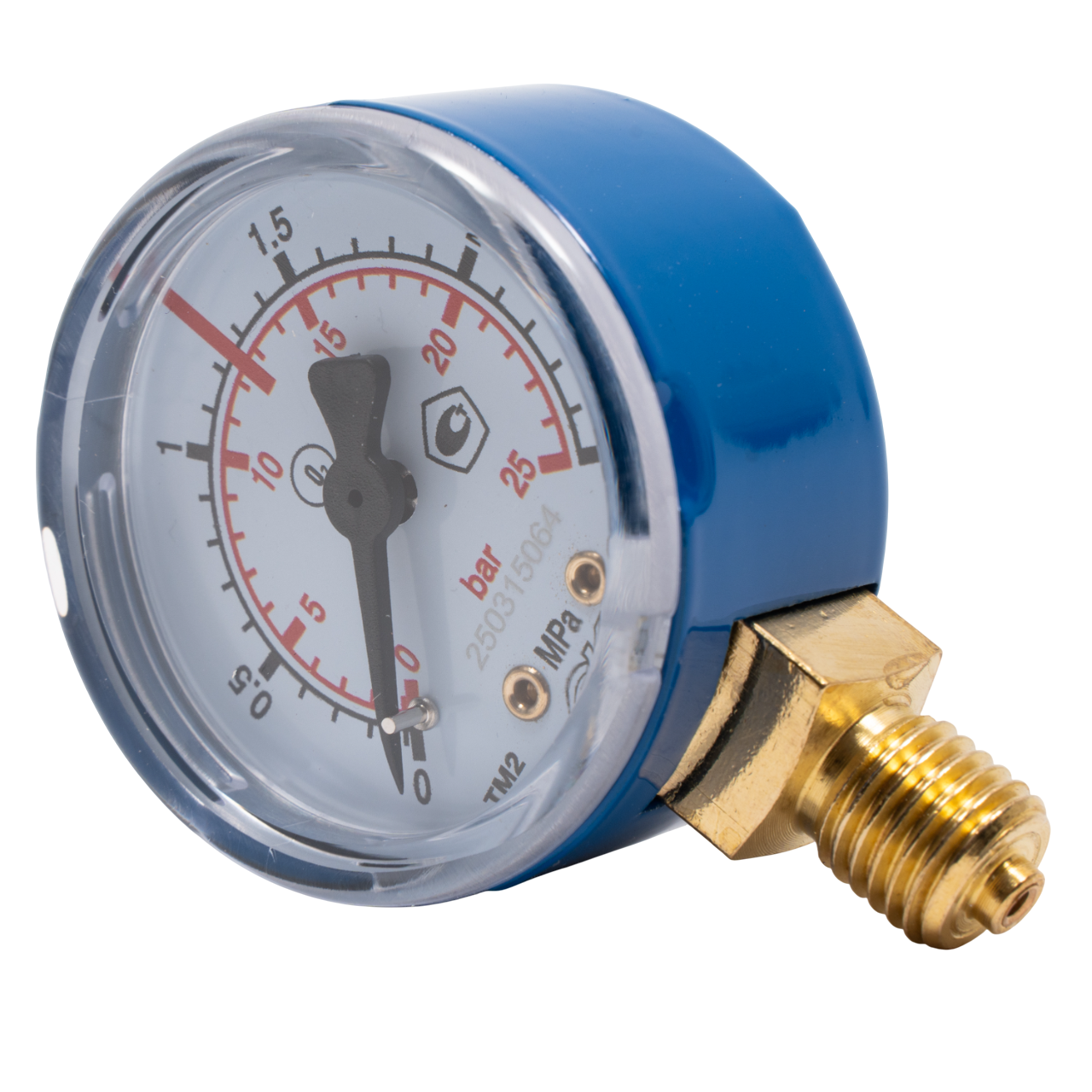 Манометр предназначен для измерения избыточного давления жидких и газообразных неагрессивных и некристаллизующихся сред. Манометр является неотъемлемой частью редуктора, вкручивается в основание с резьбой М12х1,5 с помощью ключа на 14. Штуцер имеет радиальное расположение и выполнен из латуни. Предназначен для измерения давления газа при температуре окружающей среды от -20 С до +60 С. Точность 2.5 достигается за счёт применения медной трубки Бурдона – уникального измерительного элемента. Стальной корпуса манометра диаметром 50 мм защищён техническим (органическим) стеклом, циферблат выполнен из алюминия.