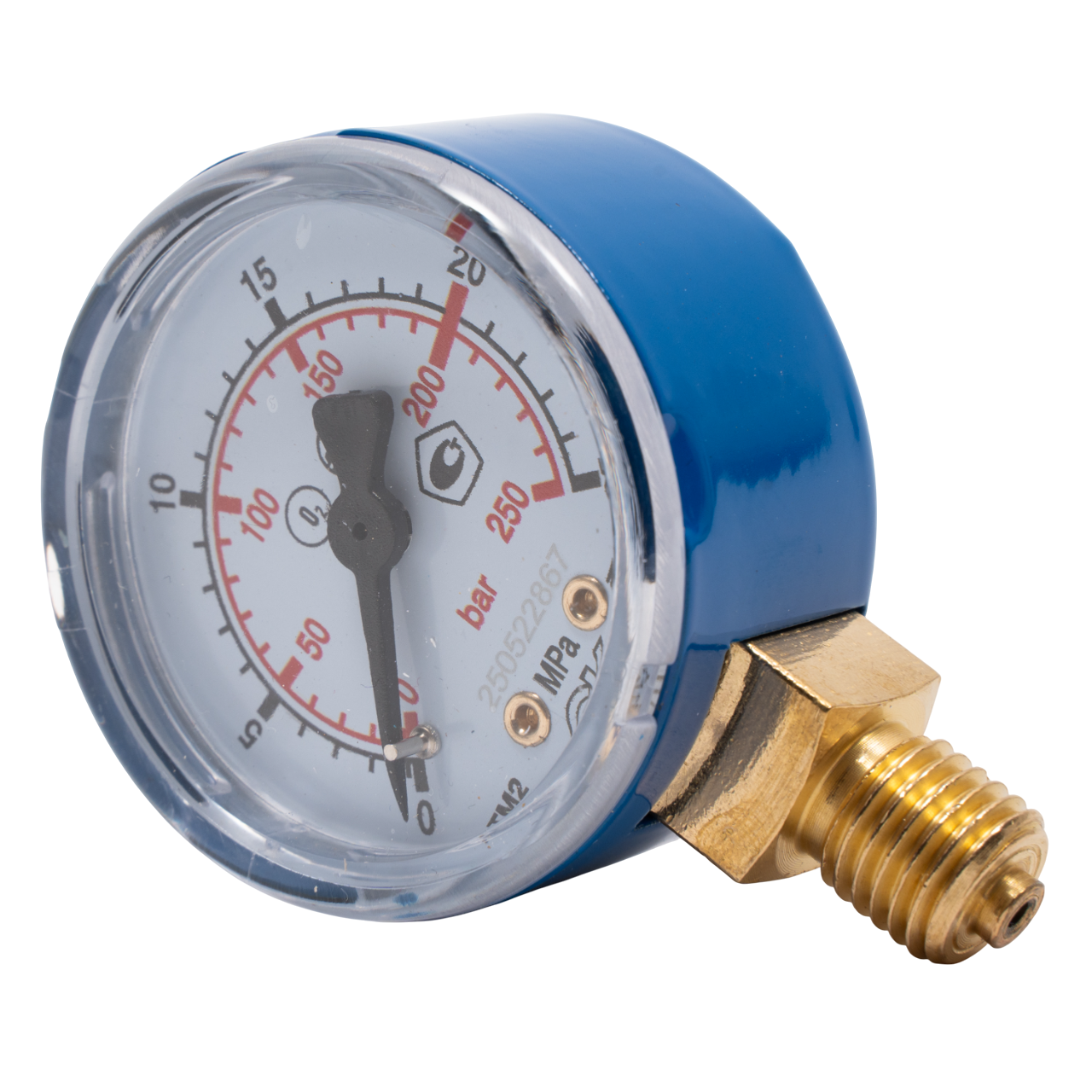 Манометр предназначен для измерения избыточного давления жидких и газообразных неагрессивных и некристаллизующихся сред. Манометр является неотъемлемой частью редуктора, вкручивается в основание с резьбой М12х1,5 с помощью ключа на 14. Штуцер имеет радиальное расположение и выполнен из латуни. Предназначен для измерения давления газа при температуре окружающей среды от -20 С до +60 С. Точность 2.5 достигается за счёт применения медной трубки Бурдона – уникального измерительного элемента. Стальной корпуса манометра диаметром 50 мм защищён техническим (органическим) стеклом, циферблат выполнен из алюминия.