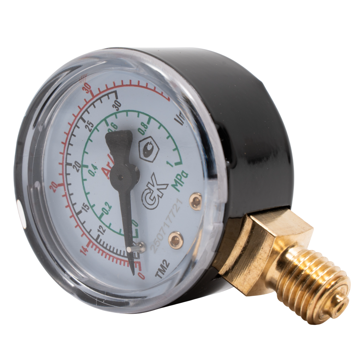 Расходомер (манометр) предназначена для измерения объемного расхода углекислого газа или аргона. Расходомер является неотъемлемой частью редуктора, вкручивается в основание с резьбой М12х1,5 с помощью ключа на 14. Штуцер имеет радиальное расположение и выполнен из латуни. Стальной корпуса манометра диаметром 50 мм защищён техническим (органическим) стеклом, циферблат выполнен из алюминия.