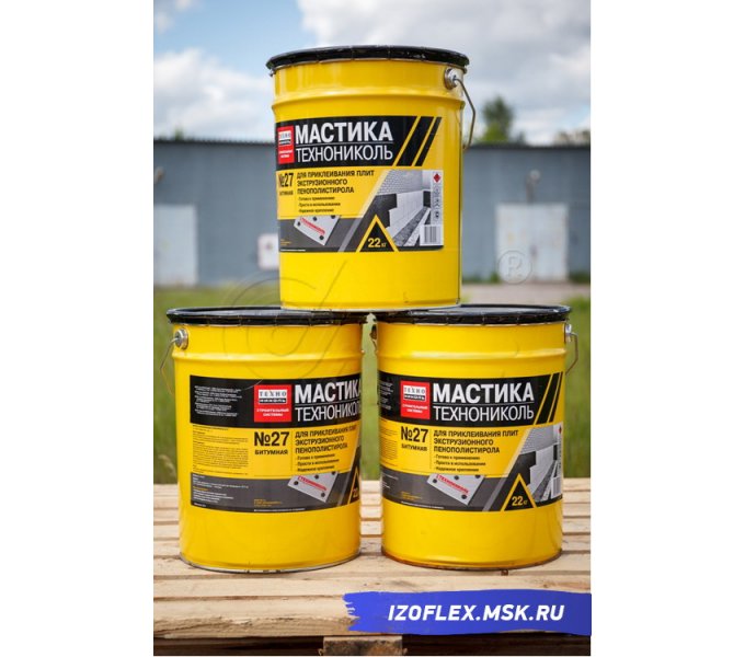 Мастика ТехноНИКОЛЬ №27 представляет собой состав, используемый для фиксации и приклеивания теплоизоляционных плит из экструдированного пенополистирола. Также посредством этого продукта осуществляется приклеивание на вертикально ориентированные, в том числе деревянные, бетонные, металлические и т.д поверхности.