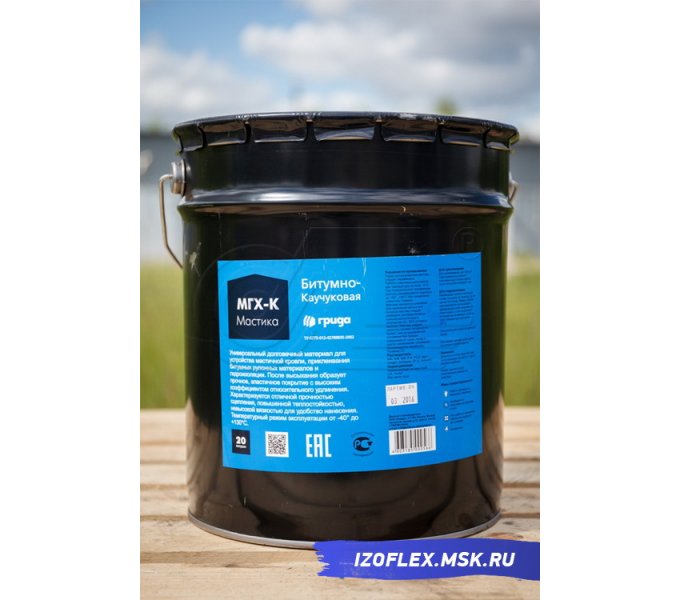 Битумно-каучуковой называется мастика, в которой превалирует битумно-каучуковая составляющая, а также присутствуют резиновая крошка, смоляные кислоты естественного происхождения и растворители. Благодаря этому МГХ-К отличается эластичностью, которая сохраняется как при достаточно низких, так и высоких температурах (-30+130 °C). Отличием от обычных мастик битумного типа является также то, что продукт характеризуется высоким значением относительного удлинения на разрыв. Проще говоря, при усадке здания мастика будет растягиваться, сохраняя при этом гидроизоляционные свойства, что снижает риск ее разрыва.