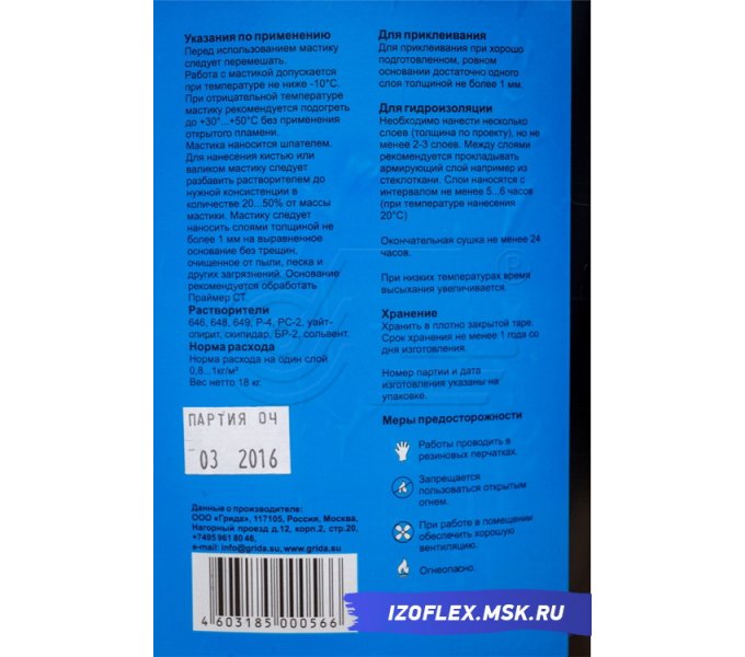 Возможно проведение работ при отрицательных, до -10 °C, температурах. Однако перед использованием следует выдержать мастику в помещении в течение суток или нагреть на водяной бане, предварительно приоткрыв крышку. Важно! Не допускается нагревание на открытом огне!