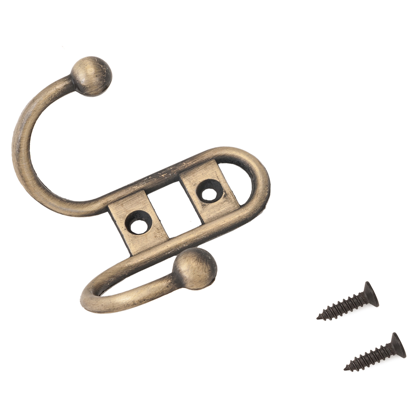 Крючок-вешалка двухрожковый. Материал — цинковый сплав. Крепеж в комплекте.