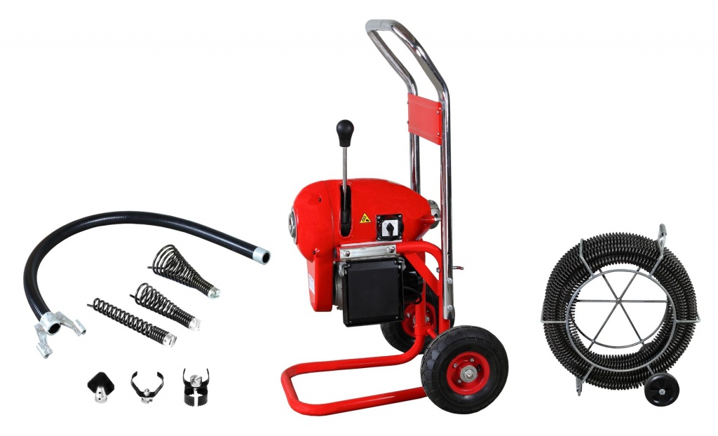 Для прочистки труб и каналов диаметром от 50 до 300 мм. Мощность 1100Вт, 230В. Максимальная возможная длина прочистки до 90м, в комплекте 4 спирали 32мм в корзине. 6 прочистных насадок 32мм.