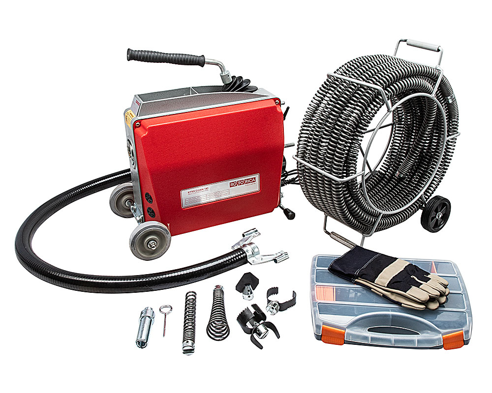 Для прочистки канализационных труб диаметром до 250 мм и на длину до 80м. Мощность 1400Вт. В комплекте с 4 спиралями 32мм в корзине и 5 насадками 32мм, шлангом и перчатками. На колесиках, насадки в кейсе.