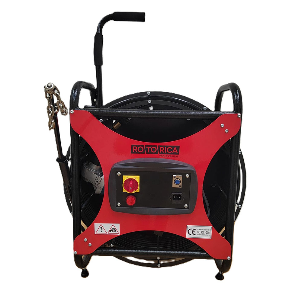 Прочистная машина с тросом в защитном кожухе для труб от 50 до 150 мм. Вращающийся барабан с автоукладкой. Рама на колесах. Мощность 1200 Вт. Частота вращения от 500 до 2900 об/мин. Длина троса 20 м. Вес 28 кг.