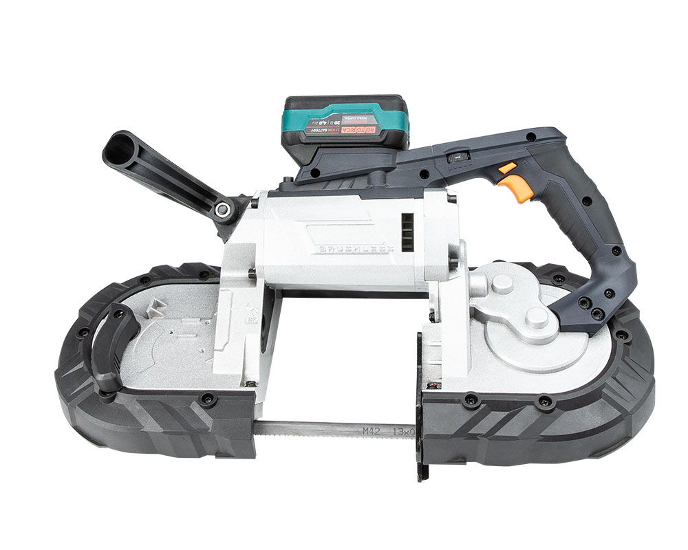 Компактная аккумуляторная ленточная пила. Бесщёточный двигатель. Шесть скоростей от 0 до 120 м/мин. LED подсветка. Максимальный диаметр резки 125 мм. Два аккумулятора Li-Ion, 20 В, 4.0 А•ч. Вес 5,9 кг.