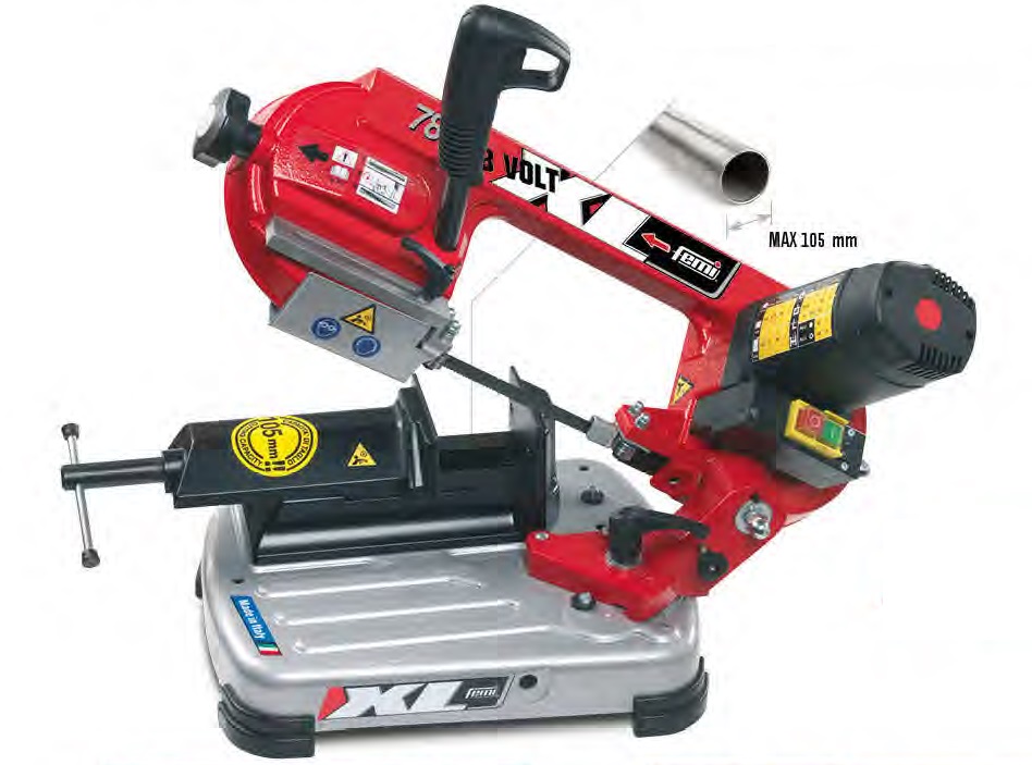 Новинка! Питание 48В! Для работы в судостроении. Мощность 560Вт (48В), скорость вращения 70м/мин, макс диаметр резки 105мм (прямоугольник 105х93мм). Длина полотна 1335мм. Вес 17кг.