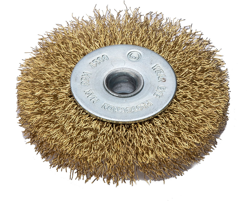 Дисковая щетка с стальным фланцем и витой стальной латунированной проволокой. Диаметр 80 мм. Посадочный диаметр 10 мм. Размер проволоки 0,3 мм. Макс. обороты 4 500 об/мин.