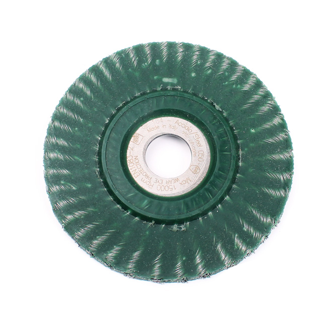 Стальная дисковая щетка с крученной проволокой. Диаметр 125мм (посадка 22,2мм). Диаметр проволоки 0.5мм. Длина проволоки 27,5мм. Проволока в полиуретановой смоле.