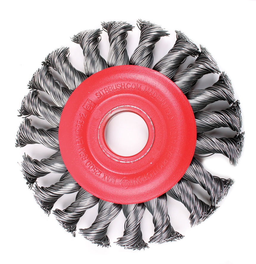 Дисковая щетка с крученной проволокой из стали. Диаметр 115мм, посадка 22,2мм. Проволока 0.5мм, длина проволоки 23мм.