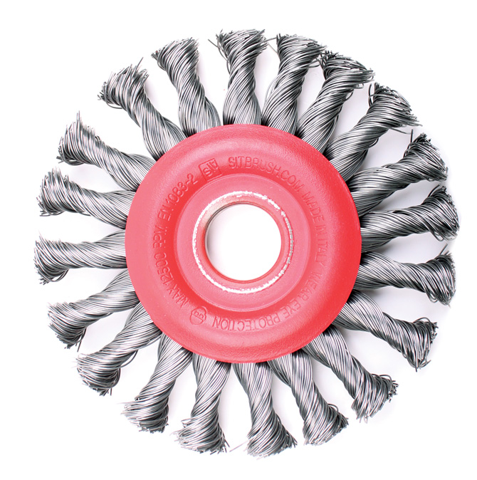 Дисковая щетка с крученной проволокой из стали. Диаметр 125мм, посадка 22,2мм. Проволока 0.5мм, длина проволоки 28мм.