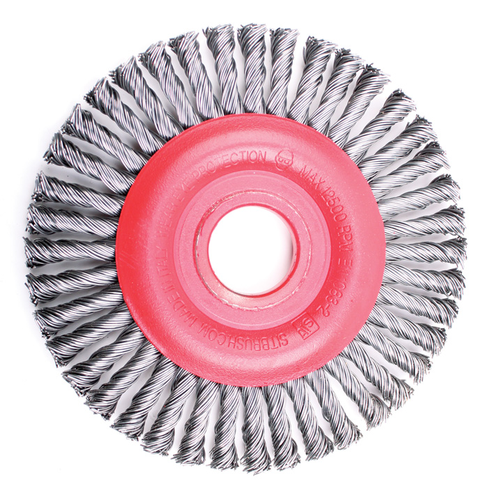 Агрессивная щетка со стальной крученной проволокой. Диаметр 115мм, посадка 22,2мм. Проволока 0.5мм, длина проволоки 23мм.