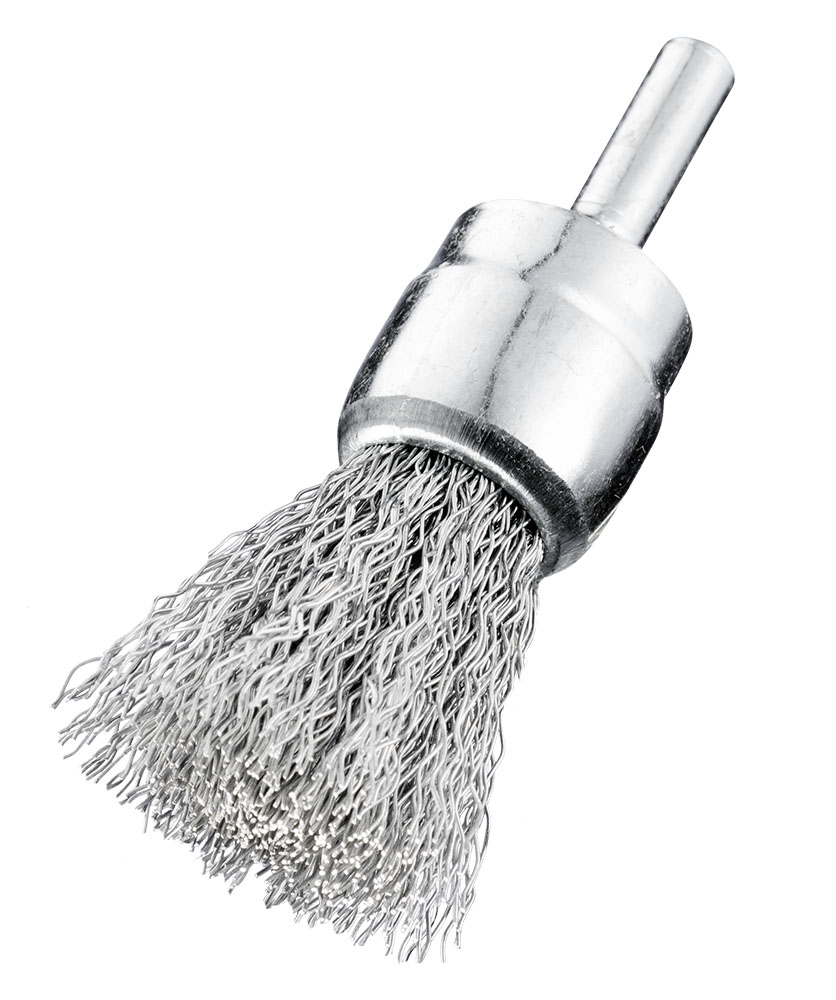 Концевая щетка с гофрированной нержавеющей проволокой. Диаметр 28мм. Хвостовик диаметром 6 мм. Диаметр проволоки 0.3мм. Длина проволоки 27мм. Макс. обороты 18 000 об/мин.