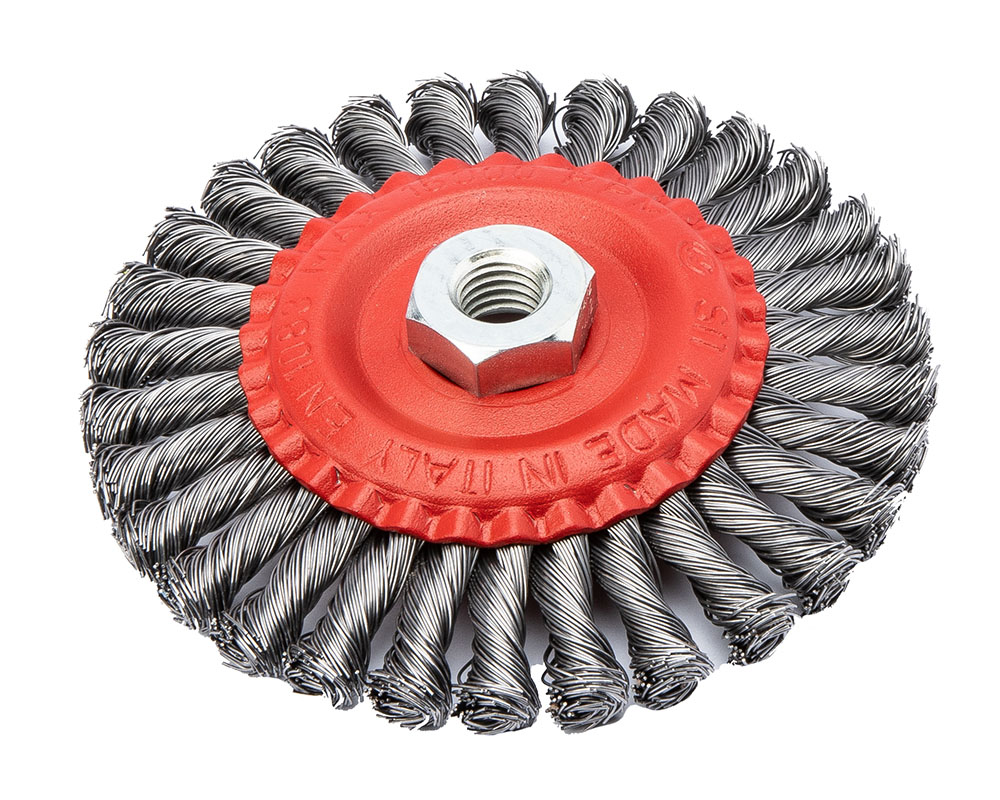 Полуконическая щетка с крученой стальной проволокой. Диаметр 125мм. Крепление М14. Диаметр проволоки 0.5мм. Длина проволоки 24мм. 30 жгутов. Диаметр жгута 10мм. Макс. обороты 15 000 об/мин.