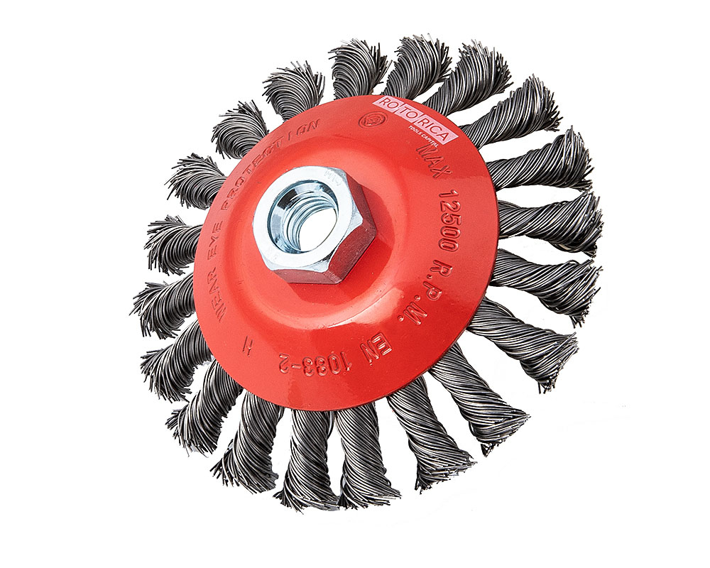 Тарельчатая щетка с крученой стальной проволокой. Диаметр 115мм. Крепление М14. Диаметр проволоки 0.5мм. Длина проволоки 20 мм. 20 жгутов. Макс. обороты 12 500 об/мин.