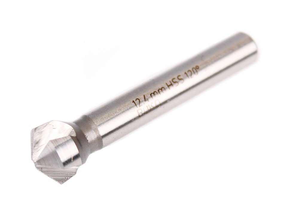 Для зенкования без заусенцев и стружки. Длина 56мм, диаметр рабочей части 12.4мм. Угол 120 градусов. Диаметр хвостовика 8мм.