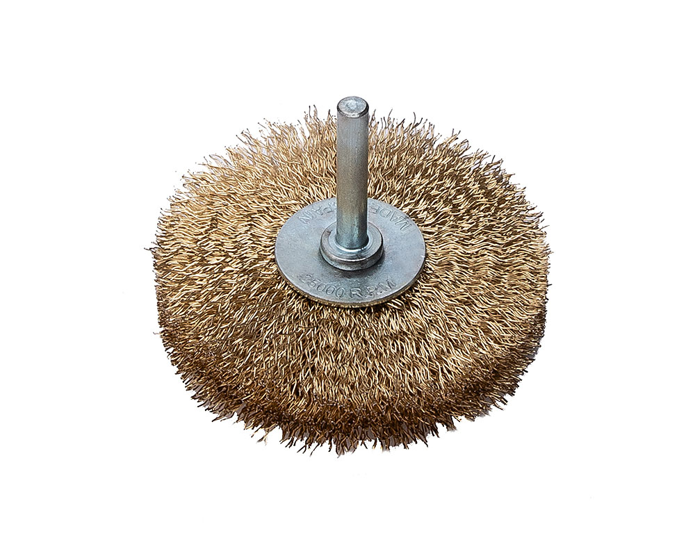 Дисковая щетка Ø 75 мм. Латунированная стальная проволока 0,3 мм и длиной 23 мм. Хвостовик 6х34 мм. Макс. обороты 25 000 об/мин.