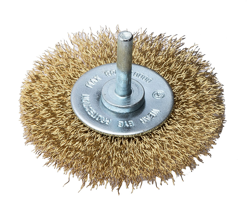 Радиальная щетка для дрели Ø 80 мм. Латунированная стальная проволока 0,3 мм. Хвостовик 6х30 мм. Макс. обороты 20 000 об/мин.
