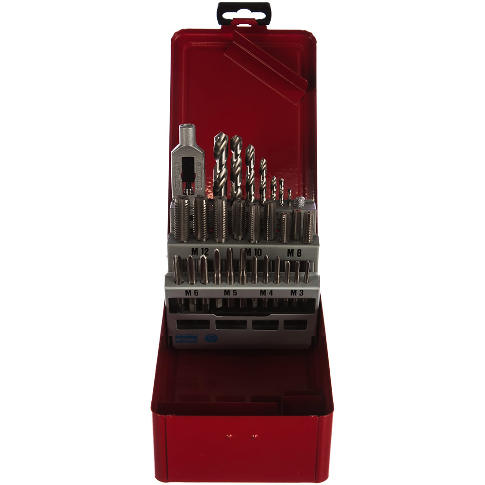 Набор ручных трехпроходных метчиков HSS M3-M12 с воротком и 7 сверлами, служат для создания резьбы в деталях из углеродистой и низколегированной стали с прочностью до 800 Н/мм².