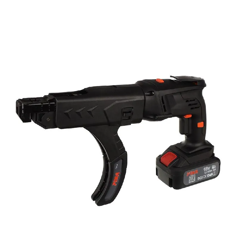 Аккумуляторный шуруповерт с автоматической подачей саморезов. 2 х 18.8В 4А Li-Ion аккумулятор, 1500/5000 об/мин, длина саморезов: 19-55мм, возможность поштучного заворачивания. 3 биты в комплекте, вес 2,5 кг