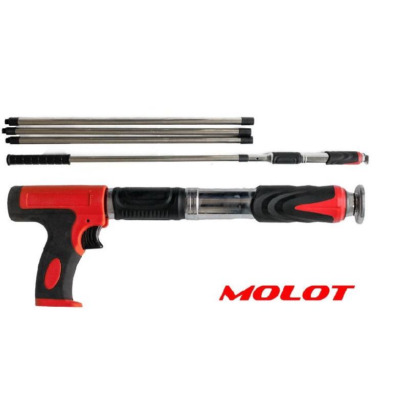 Конструкция пистолета РТ-02 «Молот» проста и надежна. Это всего лишь трубка с ударным механизмом, глушитель и два варианта ручки на выбор по ситуации. Каждый крепежный элемент содержит пороховую капсулу и дюбель. Вставив нужный вид крепления в отверстие нужно плотно приставить пистолет к месту будущего прикрепления и резко к нему придавить. Нагрузка такого крепежа выдерживает до 600 кг. на вырыв, а скорость «выстрелов» достигает до 30 штук в минуту.