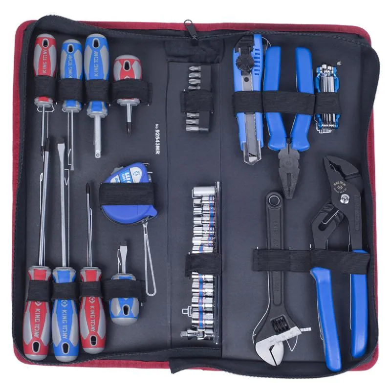 Изделие KING TONY 92543MR — это универсальный набор инструментов из 43 предметов для профессионального применения. Комплект вспомогательных приспособлений пригодится при ремонте авто и мототехники, выполнении широкого спектра слесарных работ, монтаже и демонтаже оборудования или небольших строительных конструкций. Инструменты поставляются в эргономичном зип-кейсе на молнии.