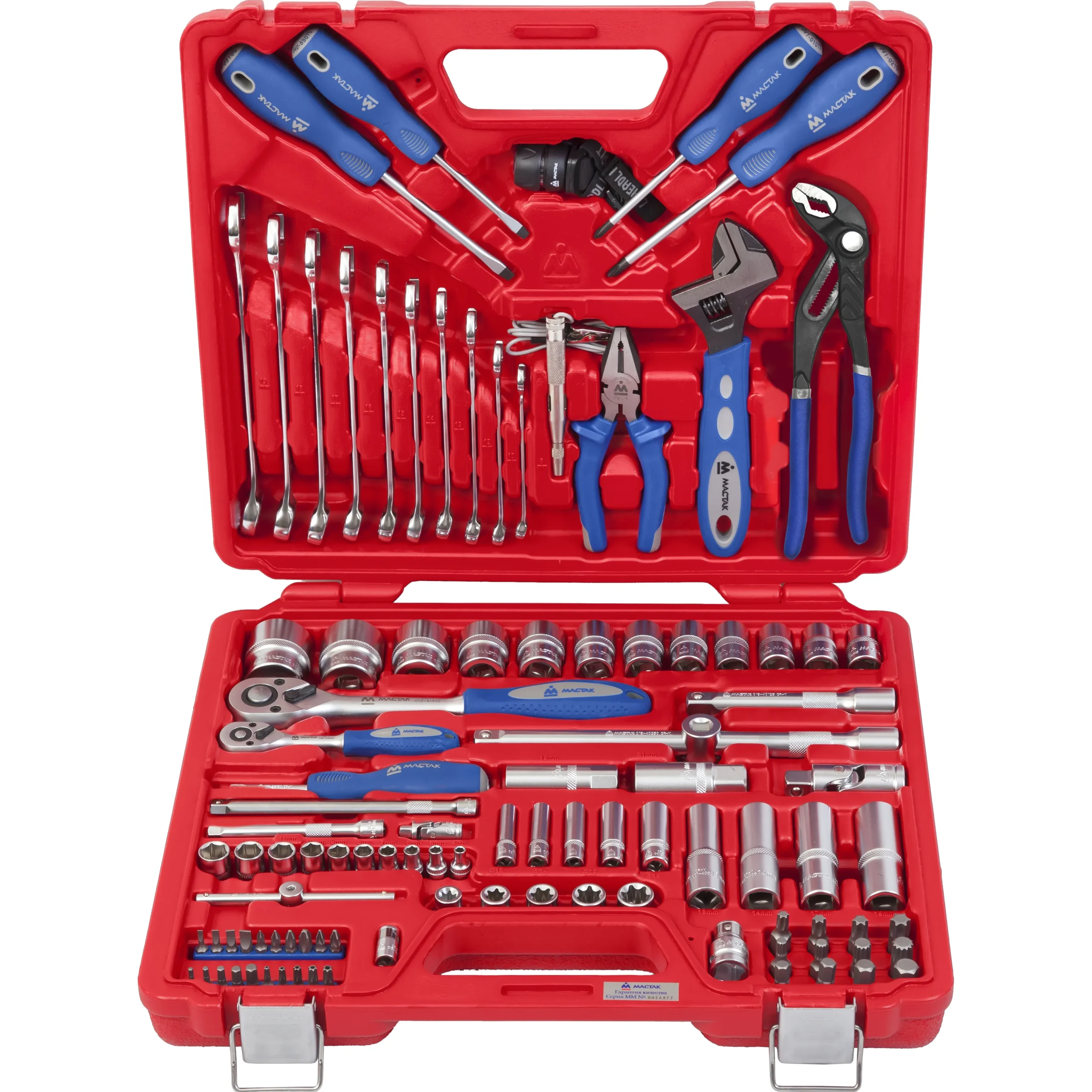 Набор инструментов МАСТАК 01-102C представляет собой полноценную мобильную мастерскую в прочном пластиковом кейсе. Профессиональный комплект включает все необходимое для ремонта автомобилей, сборки мебели и бытовых работ. Инструменты изготовлены из хромованадиевой и хромоникелемолибденовой стали, что гарантирует их долговечность при интенсивной эксплуатации.