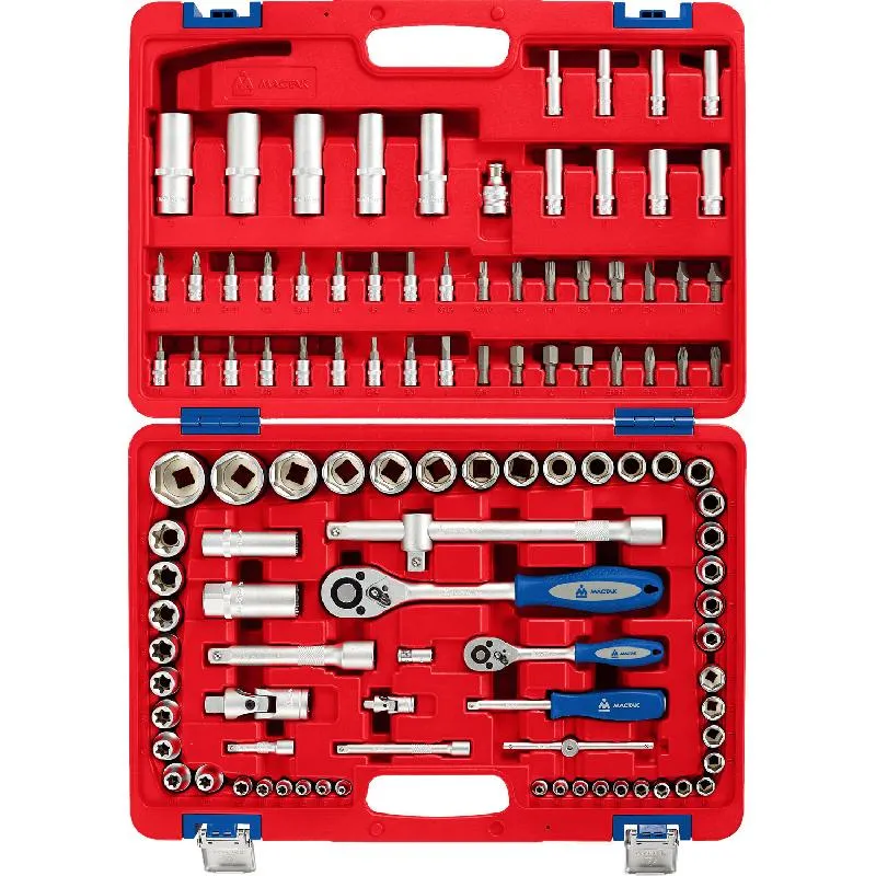 Универсальный набор МАСТАК 01-108C представляет собой полноценную мобильную мастерскую в прочном кейсе. Профессиональный комплект включает все необходимые инструменты для диагностики, обслуживания и ремонта автомобильных узлов. Головки и биты изготовлены из хромованадиевой стали (Cr-V), обеспечивающей повышенную износостойкость при интенсивной эксплуатации.