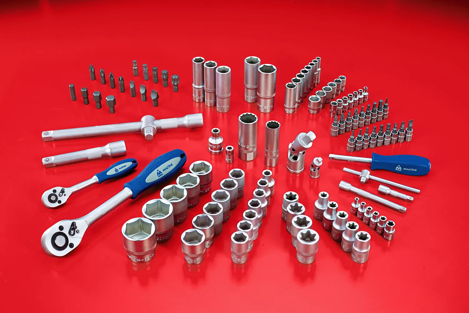 20 шестигранных головок (8-32 мм), 9 головок Е-типа (E10-E24), свечные головки 16 и 21 мм с резиновым фиксатором. Флажковая трещотка на 45 зубцов с удлинителями 125 и 250 мм, карданный шарнир 72 мм.
