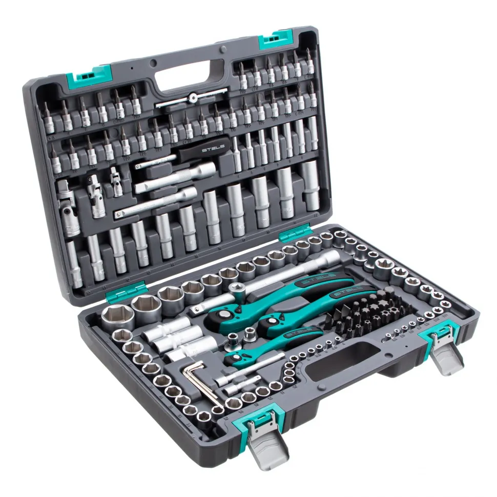 Набор инструмента 1/4″, 3/8″, 1/2″, CrV, S2, усиленный кейс, 151шт STELS 14114 — оптимальный вариант комплекта ручных инструментов и аксессуаров для выполнения ремонтно-монтажных работ в гаражах, автосервисах и профессиональных СТО.