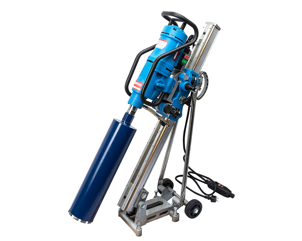 Установка для бурения отверстий в железобетоне диаметром до 400 мм, в кирпиче до 650 мм. Максимальная длина коронки 700 мм. Мощность двигателя 4 кВт. Трехскоростной двигатель — 250 / 450 / 750 об/мин. Стойка с колесами, наклоном до 45 о и двухскоростным редуктором подачи каретки.